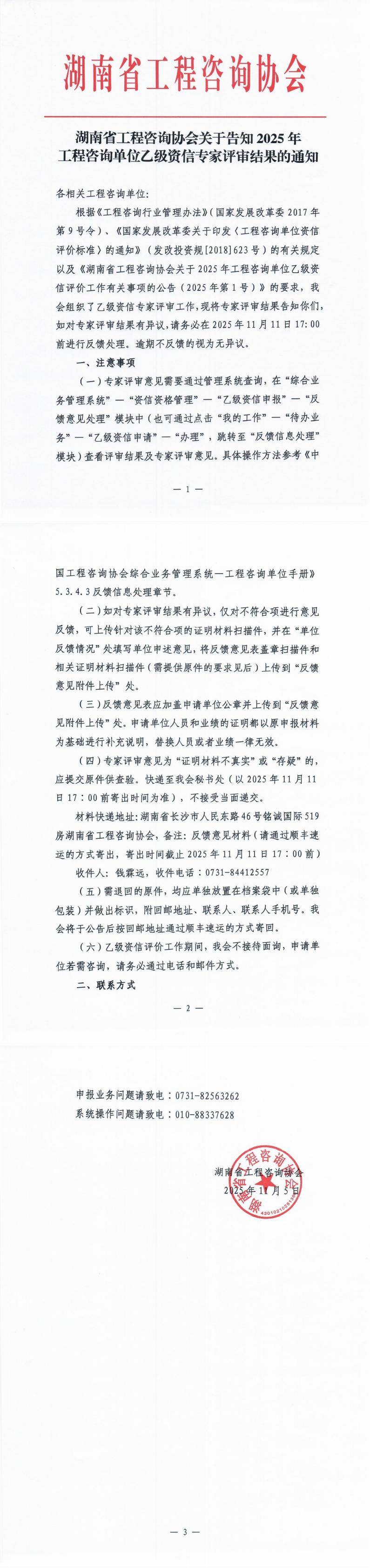 湖南省工程咨询协会关于告知2025年工程咨询单位乙级资信专家评审结果的通知