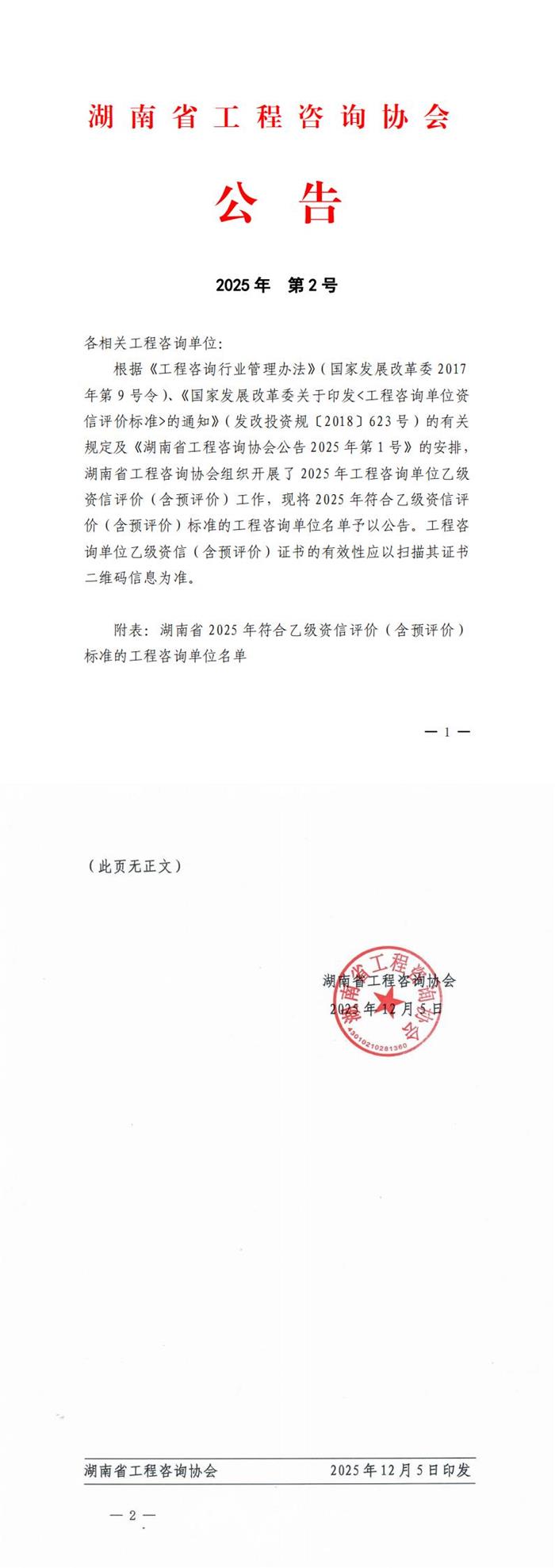 最新通知公告:关于公示2025年湖南省工程咨询单位乙级资信评价(含预评价)结果的通知
